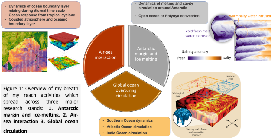 My research focuses on understanding how small-scale ocean processes regulate large-scale climate dynamics, with a particular emphasis on the tropical oceans and the Southern Ocean (Figure 1). I investigate how turbulence, convection processes control vertical mixing, heat transport, and water mass transformation—key mechanisms that influence global ocean circulation and climate variability.