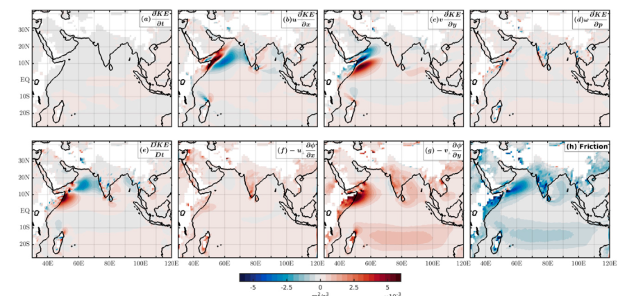 Figure 1: Seasonal-mean kinetic-energy budget of the Somali jet region, illustrating the balance between kinetic energy generation and northward advection in the near-equatorial jet-forming region, from Masiwal et al. (2023).