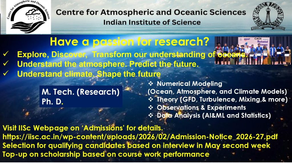CAOS takes students under three categories, namely, M.Tech. (Earth and Climate Science) and Ph.D. We encourage students with Batchelors and/or Masters degrees in Engineering and the Physical Sciences, who have an interest in Atmosphere-Ocean-Climate Science, apply to our Centre. Additional information about CAOS can be found on our webpage. Selection of students is based on an interview. To be called for the interview, passing a national examination such as GATE, CSIR/UGC JRF is necessary. Details of these programs, including background, course work, career opportunities and a timeline can be found on the Graduate Programs webpage. Additional information about admission to IISc can be found on the main Admission Page.