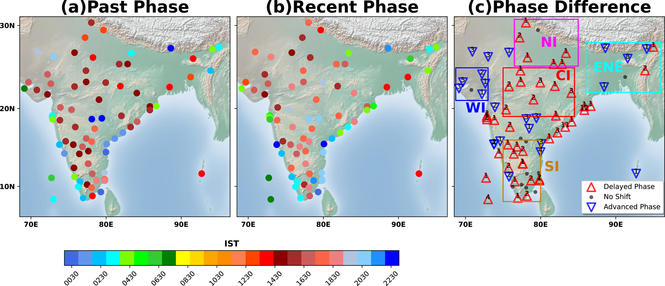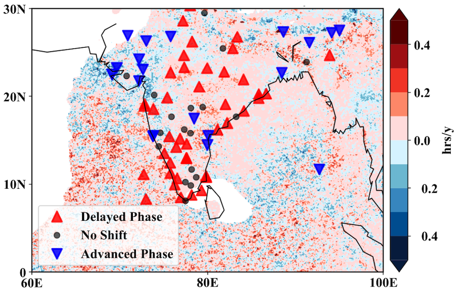 The trend of the phase of diurnal cycle of rainfall calculated from Integrated Multi-satellitE Retrievals for GMP (IMERG) half-hourly rainfall data for the period 1998-2023 over the Indian domain clearly shows that the phase shift from station data (red and blue triangles) matches with the nature of trend found from IMERG data. Thus, change of phase of diurnal cycle of rainfall over these stations is robust.