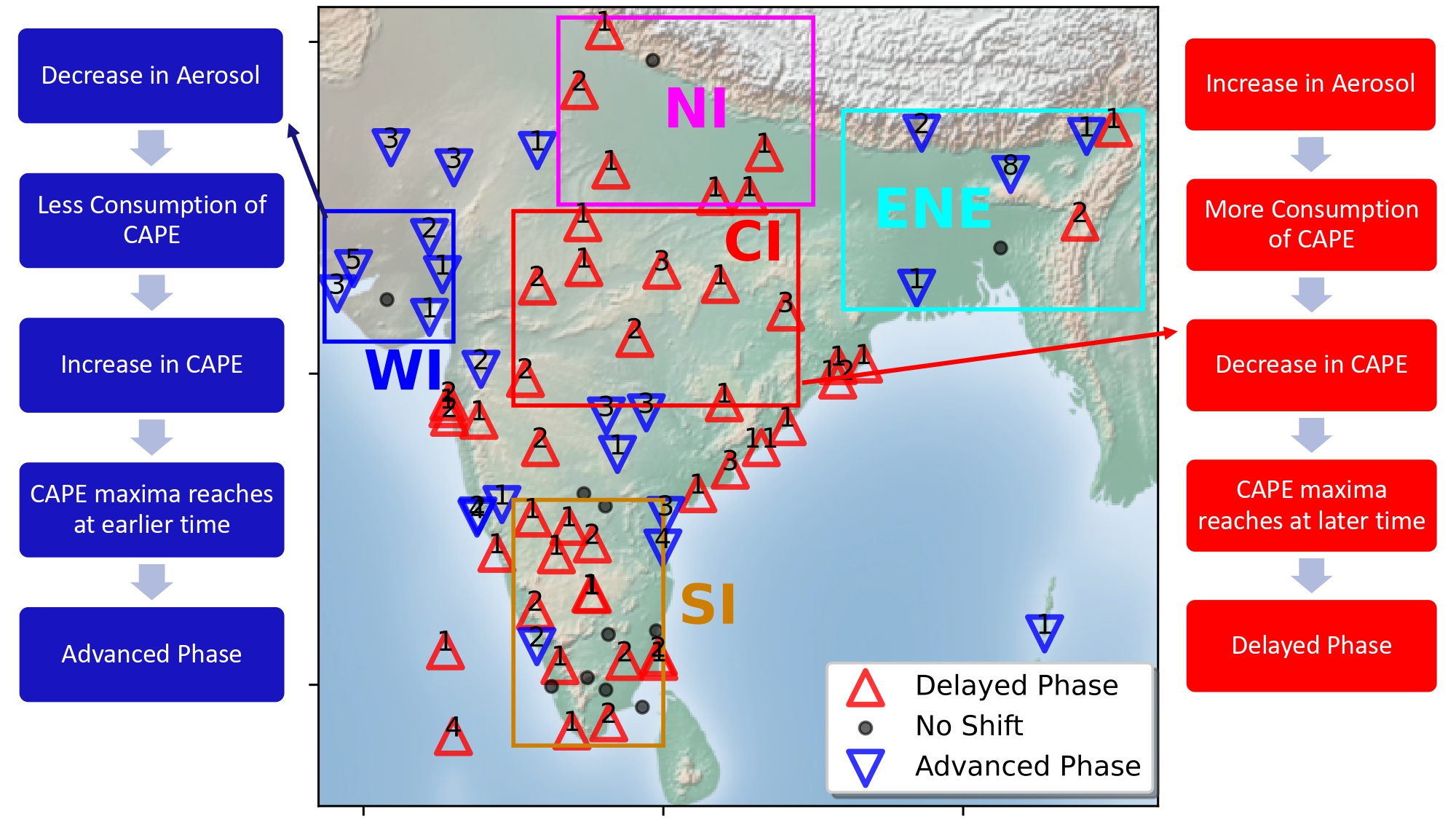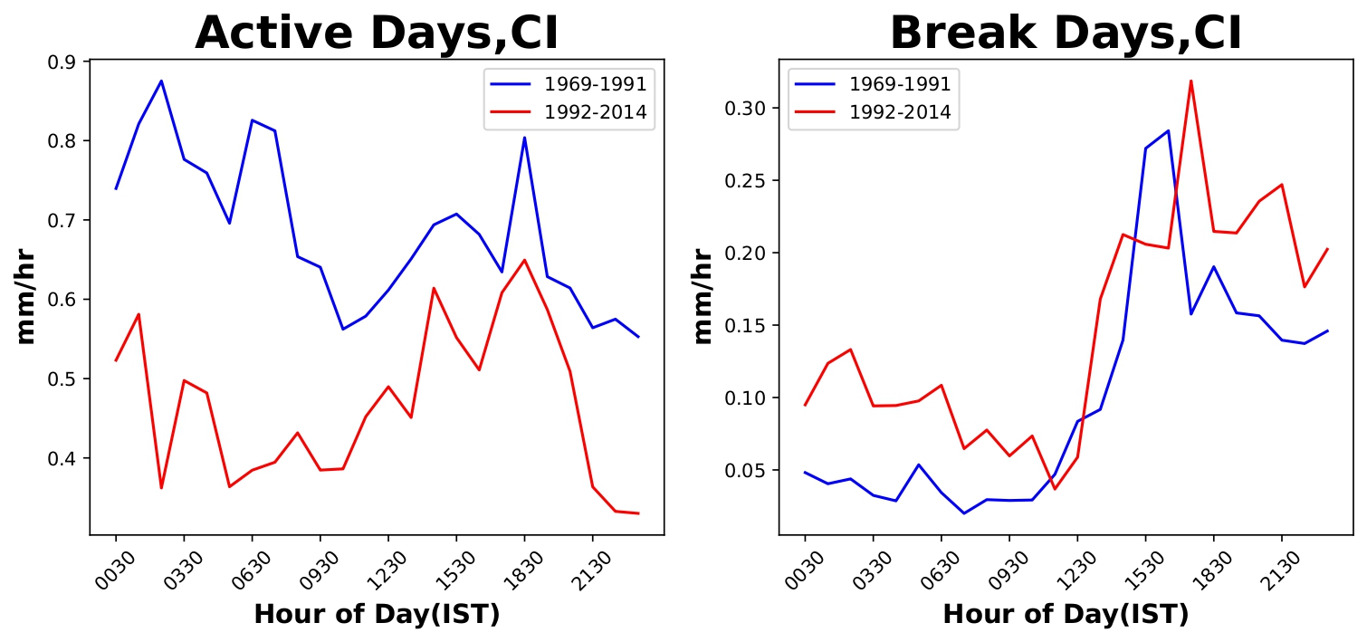 No change of phase for active days but for the break days, the phase has been shifted to a later time of the day. Moreover, increase in the number of break days is found in recent epoch over Central India. Thus, increase in break days over Central India is another cause for delayed phase over this region.
