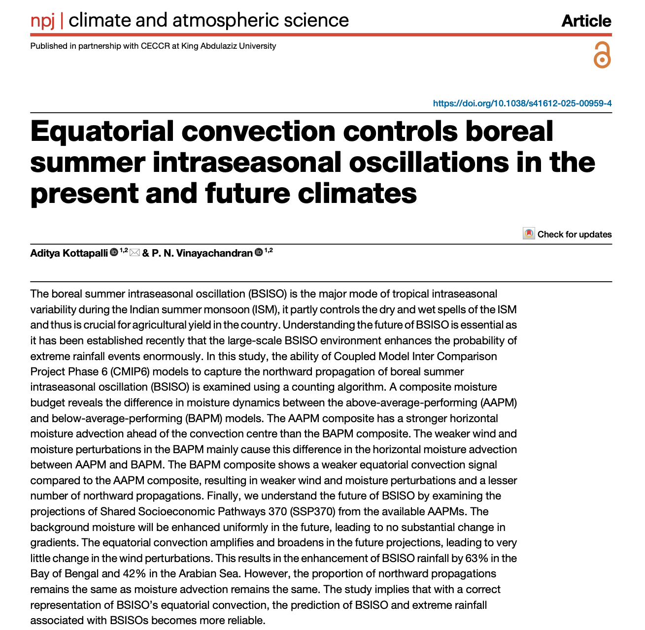 - Kottapalli, A & Vinayachandran, P. N. (2025): Equatorial convection controls boreal summer intraseasonal oscillations in the present and future climates. npj | Climate and Atmospheric Science, https://doi.org/10.1038/s41612-025-00959-4.